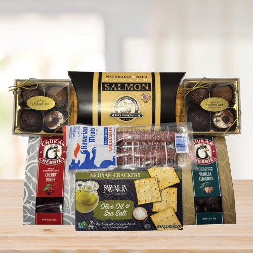 Included with this thoughtful gift is a variety of snacks your friends can feast on: 2oz Partners® crackers, 2oz Smoked Salmon, Brie Cheese, 2pc Bavarian Meats™ Landjaeger, two assorted varieties of Chukar chocolate covered cherries 2.75oz, and 4pc Chocolati™ Truffles. The gift comes wrapped in clear cellophane and topped with a handmade sheer bow (not pictured). This cutting board gift with snacks measures approximately 12"l x 9"w x 4"h and serves 2-4 people, perfect for sharing and enjoying together.