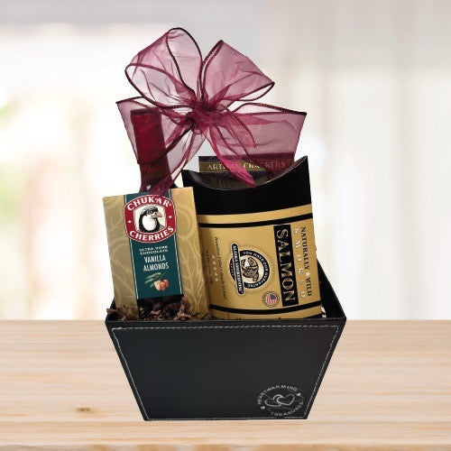 This salmon gift basket features a reusable 8" faux leather bin containing the exquisite combination of wine, salmon and snacks: 750ml bottle of wine, 2oz Smoked Salmon, 2oz Partner Crackers, Chukar Cherries chocolate covered nuts or cherries in a clear bag (not pictured) and topped with a deep red bow. This gift basket measures approximately 8"l x 6"w x 7"h and serves 2-3 people.